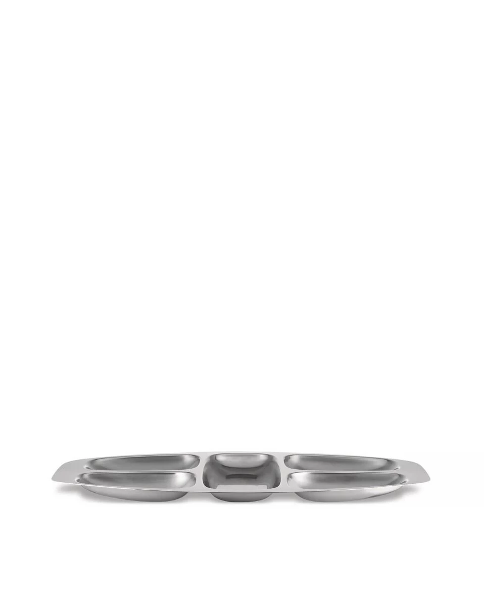 De Alessi 5 vaks serveerschaal is gemaakt van glanzend 18/10 roestvrij staal. De strak vormgegeven schaal heeft een lengte van 45cm en een breedte van 25cm met daarin 5 vakken van verschillende maten. De serveerschaal is ontworpen door Anselmo Vitale en Carlo Mazzeri en past goed bij een klassiek Frans gedekte tafel. Gebruik de schaal voor het serveren van tapas, antipasti of kleine bijgerechtjes.Â