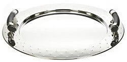 Dit ronde dienblad van Alessi is gemaakt van gepolijst 18/10 roestvrij staal en heeft kunststof handgrepen. Het Alessi dienblad is ontworpen door Michael Graves en heeft een diameter van 48 cm. Ideaal voor het serveren en presenteren van drank en gebak.