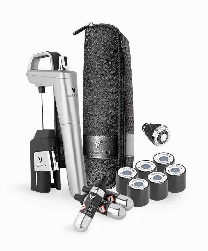 Coravin’s Timess Six + pack wijn conserveringssysteem wordt geleverd met: