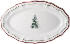 De ontwerper Marie-Hélène Mazure heeft speciaal de collectie “Filet Noël” ontworpen voor Gien France. Het van aardewerk gemaakte kerstservies is versierd met een besneeuwde kerstboom. Met de romantische uitstraling van dit servies is de dinertafel helemaal in de kerstsferen. De rand van de serveerschaal wordt geaccentueerd met een rode en groene handgeschilderd draad. De schaal is 41 cm x 26,2 cm.