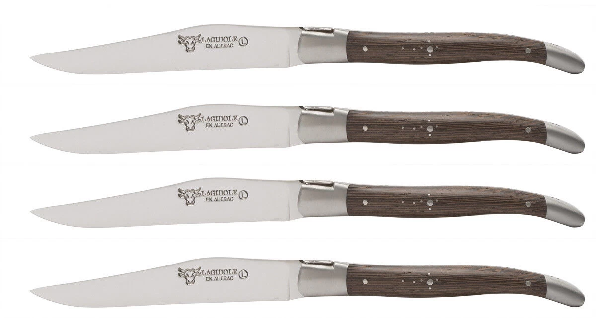 De Laguiole en Aubrac steakmessenset bestaat uit 4 messen met een messenstalen lemmet van 11,5 cm. Het totale mes heeft een lengte van 23 cm. Het heft van het mes is van donkerbruin wengéhout. U gebruikt het steakmes met de gladde snede voor het snijden van bereid vlees aan tafel.