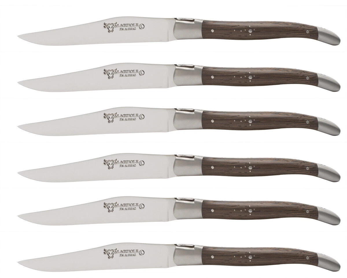 De Laguiole en Aubrac steakmessenset bestaat uit 6 messen met een messenstalen lemmet van 11,5 cm. Het totale mes heeft een lengte van 23 cm. Het heft van het mes is van donkerbruin wengéhout. Dit is voorzien van een Shepherd’s Cross, een van metaal ingelegd kruis. Hierdoor hadden katholieke herders altijd een kruis bij zich wanneer zij zich op de steppen bevonden.