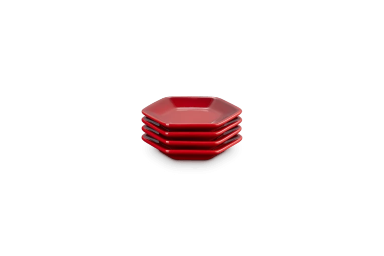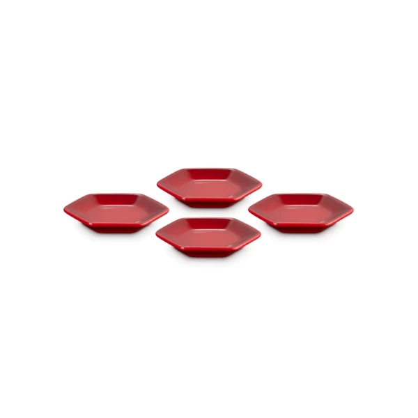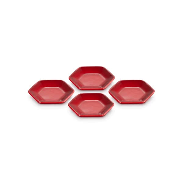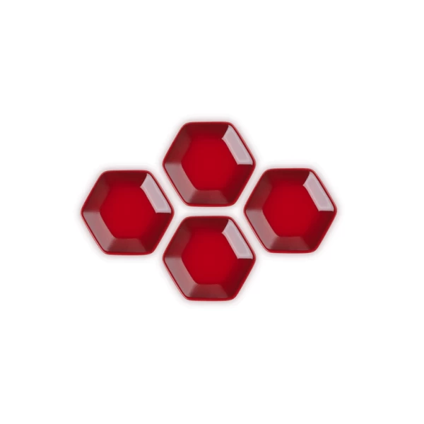 De vier Le Creuset serveerschaaltjes zijn gemaakt van geglazuurd aardewerk, uitgevoerd in kersrood. De schaaltjes zijn 8,5 cm breed, 9,5 cm lang en 1,5 cm hoog. Gebruik om (dip)sauzen te serveren.