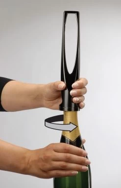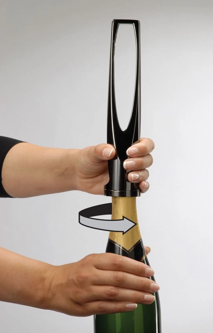 Verwijder de capsule en muselet van de fles en plaats de Pop Bulle op de fles. Houdt de kurkentrekker stevig vast en draai de fes langzaam rond tot de kurk eruit schiet. De Pop Bulle vangt de wegschietende kurk op en geeft de ruimte voor een bevredigende “plop” bij het openen.