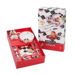 Alle onderdelen zijn voorzien van een vrolijke illustraties in race thema. De complete set wordt geleverd in een luxe kadoverpakking.
