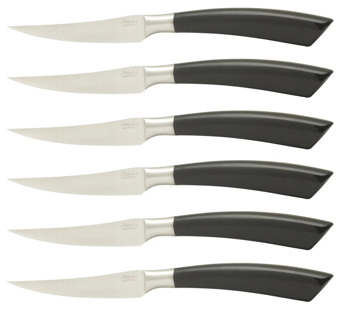 Deze 6 Saladini steakmessen zijn van messenstaal en hebben een zwart heft van buffelhoorn. Elk lemmet is 10 cm lang en elk heft 13 cm. De steakmessen zijn ideaal voor gebruik aan tafel, voor bijvoorbeeld het snijden van biefstuk.